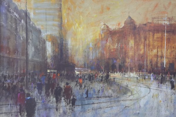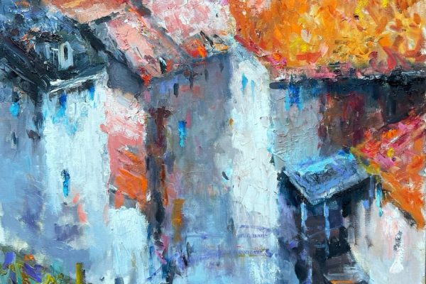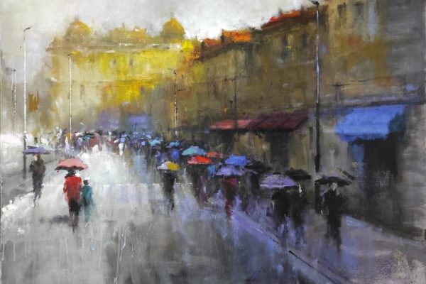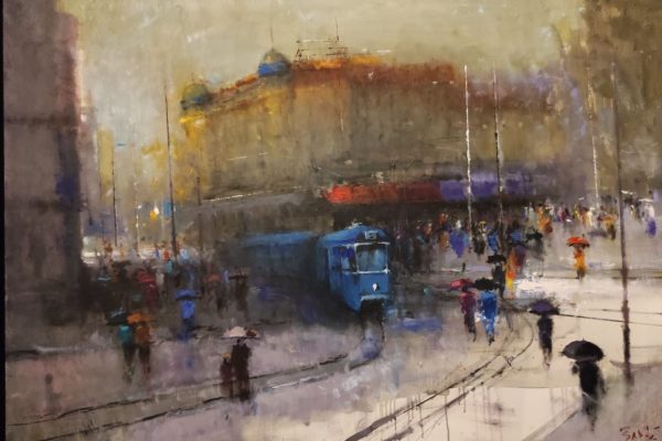 To je šaroliko. Gledao sam iz jednog kafića na ulicu. Bilo je to vrijeme rata, padala je kiša i ono što sam vidio bili su ljudi, izbjeglice koje tumaraju, vuku neke svoje stvari, nespoznati ‘nevažni’ ljudi. Vidio sam kako ih građani zaobilaze, gledaju nekako postrance kao da su gubavi. Od tada sam skoro isključivo slikao baš te prizore, te nesretne nepoznate ljude na gradskim ulicama i trgovima. Oni nikad nemaju lica, oni su samo sivo crne mrlje koje tumaraju. To iskustvo me se snažno dojmilo.