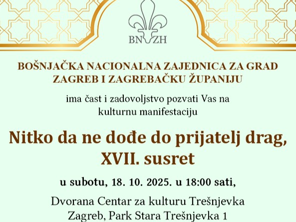 Uncategorized Tradicionalni kulturno-umjetnički program “Nitko da ne dođe do prijatelj drag”, subota 18. 10. u 18 sati – Zagreb, Centar za kulturu Trešnjevka Date: 13 listopada, 2025Author: bdomazet@gmail.com 0 Comments