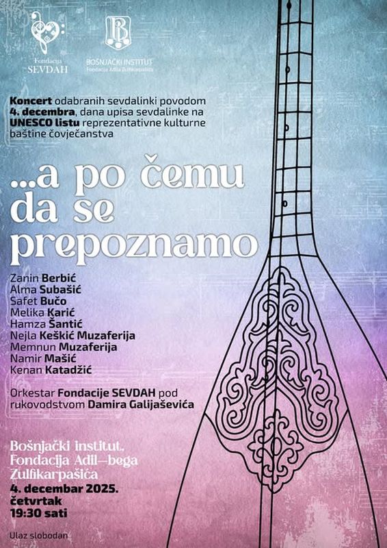 U povodu prve godišnjice uvrštenja sevdalinke na UNESCO listu nematerijalne kulturne baštine, na dan 4. prosinca ove godine, u ambijentu Bošnjačkog instituta – Fondacije Adil-bega Zulfikarpašića i u organizaciji Fondacije Sevdah, održan je koncert odabranih sevdalinki pod nazivom „… a po čemu da se prepoznamo“. Naslov koncerta preuzet je iz pjesme „Šta se ovo Bosnom čuje“, čiji je autor veliki sevdalija i pjesnik Rade Jovanović (Goražde, 1928-1986), a 1986. godine pjesmu je snimio velikan sevdalinke Safet Isović, uz orkestar i aranžman Omera Pobrića.