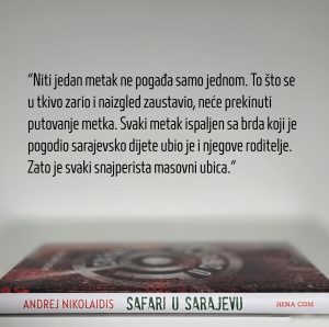 U postjugoslavenskim književnostima teško je naći većeg mizantropa no što je Andrej Nikolaidis. Ako su ljudske naravi i priroda čaša, za ovog bosanskohercegovačkog pisca ta čaša jest i uvijek će biti poluprazna, a ne polupuna. Nikolaidis u svemu – od turizma do obiteljskih odnosa – svaki put nanovo pronalazi razloge da se snebiva nad ljudskom beščasti. Treba li onda biti iznenađen što se Nikolaidis latio teme u kojoj je kristalizirana grozota ljudske vrste: ta tema je ono što je novinarstvo ne baš umjesno imenovalo kao “Sarajevo safari”. Oko ratnog turizma ljudi koji su plaćali da bi snajperom ubijali građane Sarajeva. Nikolaidis je izgradio mali, briketirani hard boiled krimić u kojem se balkanski nacionalizmi prepleću s Casom Pound i zapadnom alternativnom desnicom, a prikaz suvremene, tranzicijske Bosne s općim mjestima tvrdo kuhanog krimića.