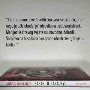 Rijetko koji pisac ima tu sposobnost da momentalno može odreagovati na stvarnost i napisati roman o vijesti decenije u regiji, a to je Safari u Sarajevu. Takav pisac je Andrej Nikolaidis, koji se odlučio da od ovog ratnog događaja pokrivenog debelom tamom ćutanja i tabua, napiše brz roman, kompaktan kao bomba. Riječ je, uslovno, o detektivskom romanu u kojem je detektiv toliko prljav da je u odnosu na njega Harvey Keitel iz Zlog poručnika poletarac. I takav privatni detektiv, antijunak, nihilista, navikao da prima i da zadaje udarce, upušta se u avanturu potrage za istinom. Naravno, to nije žanrovski roman o (bukvalno) neviđenom zločinu koji je ravan nacističkom uživanju u zlu, ovo je knjiga o nama, o evropskoj civilizaciji ogrezloj u krvi. Nihilistički traktat u Nikolaidisovu stilu, umotan u krimi-priču. Ispisan rukom nekog ko nema iluzija o ljudskom progresu. Snažna proza, s potresnim pasažima, ali s dovoljno (auto)ironije i uvida u postratnu BiH da baca daleko od uobičajene predstave nas o nama. Bez patetike, sladunjavosti, nostalgije. Jačina (i razočaranost, crnilo, mučnina) ovog romana šaka je u stomak nesviklom na odvratnu spoznaju kojoj nas izlaže ova knjiga. Kada je pročitate, imaćete još manje iluzija nego što ste ih imali na početku čitanja.