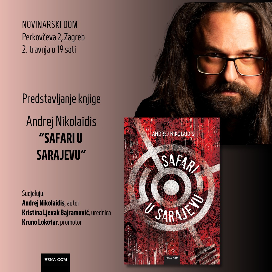 Kratki roman Andreja Nikolaidisa „Safari u Sarajevu“ predstavljen je u Zagrebu, 2. travnja 2026. u Novinarskom domu, uz promotora Krunu Lokotara, urednicu knjige Kristinu Ljevak Bajramović te samog autora.